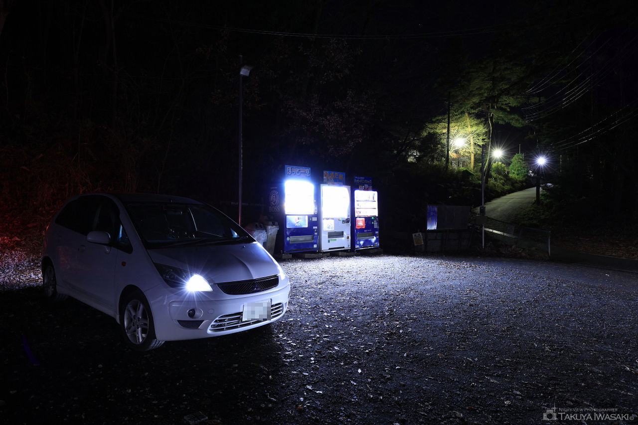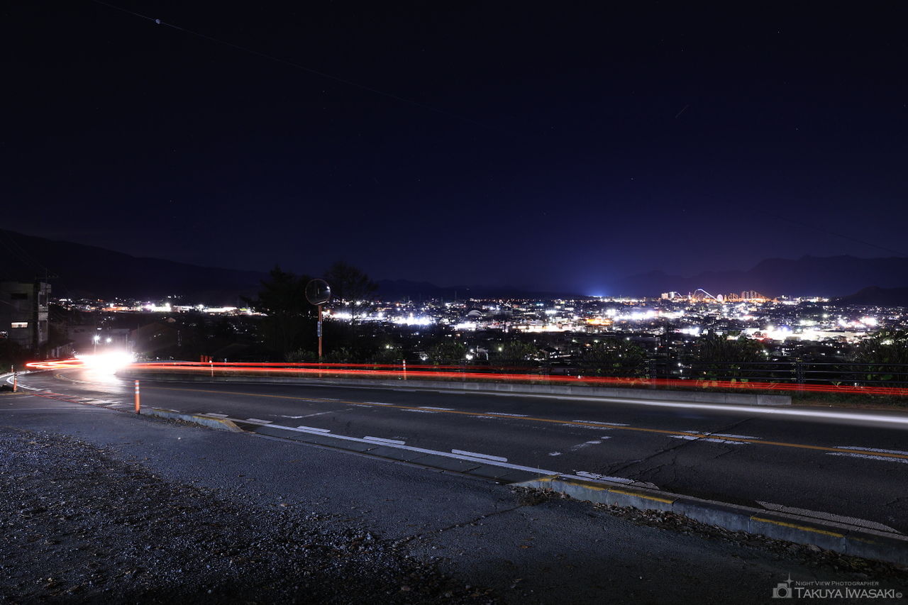 富士吉田市と忍野村を結ぶ道路沿いにある夜景スポットで、車が停車できる広場のようなスペースになっています。車を停めて、富士吉田市の夜景が一望でき、遠くには富士急ハイランド方面の夜景も観賞できます。手軽に夜景を楽しめる環境ですが、車の通行量が多く、時間帯によっては、静かに会話や夜景を楽しめる雰囲気ではありません。それでも、自動販売機もあり、温かい飲み物を片手に夜景を楽しめる場所は貴重と言えます。
