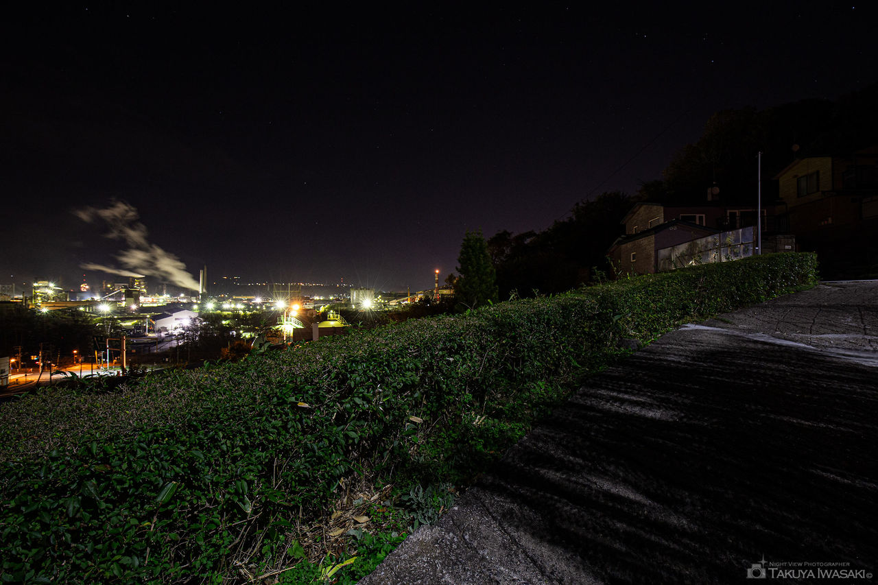 室蘭ユースホステル付近の視界が開けたビューポイント。街明かりと距離はありますが、白鳥大橋のライトアップや新日鐵住金を中心とした工場夜景が見渡せます。