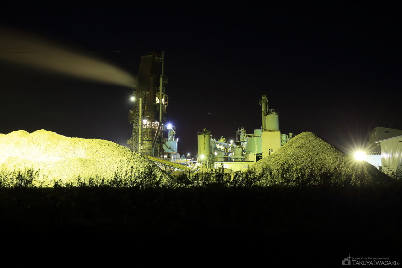 石炭工場の手前がビューポイント。石炭の間から見える工場の明かりが幻想的です。