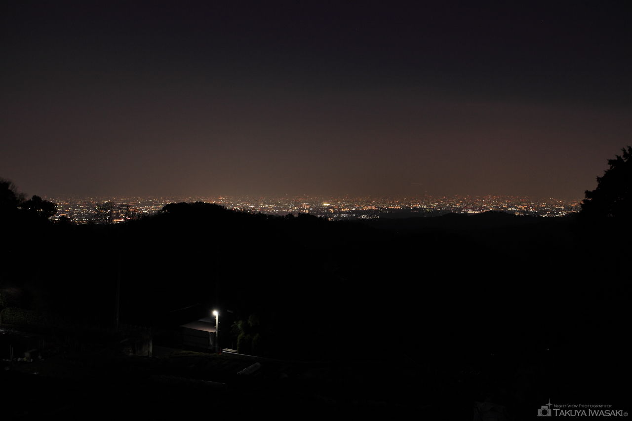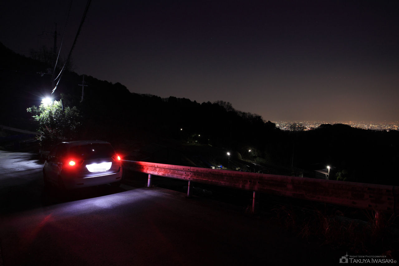 ハイキング・登山コースとして地元では知られている標高509.8mの竜王山。山頂には木造の展望台があり、視界が開けているようですが、夜間は車の通行も禁止されている険しい坂を上る必要があるため、夜の登山に慣れている人以外にはお勧めができません。ただ、忍頂寺付近の道路からは視界が開ける場所があり、山頂まで登らなくても、車を停めて大阪・北摂エリアの夜景を観賞できます。