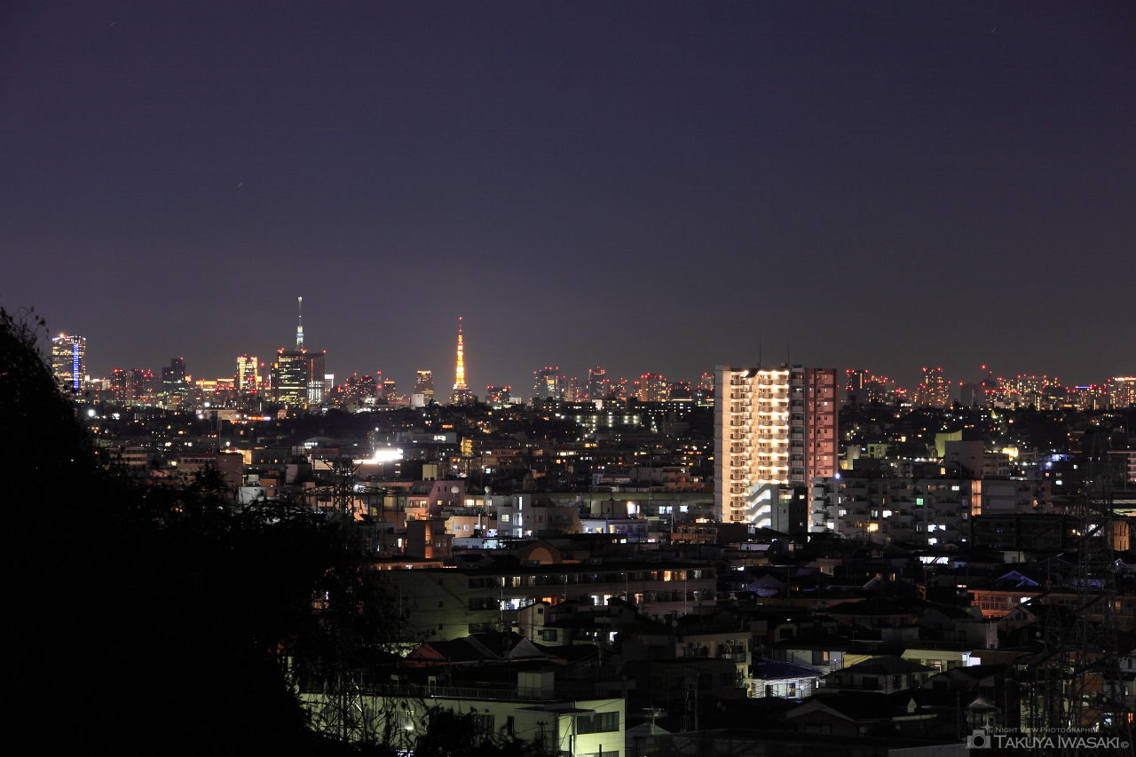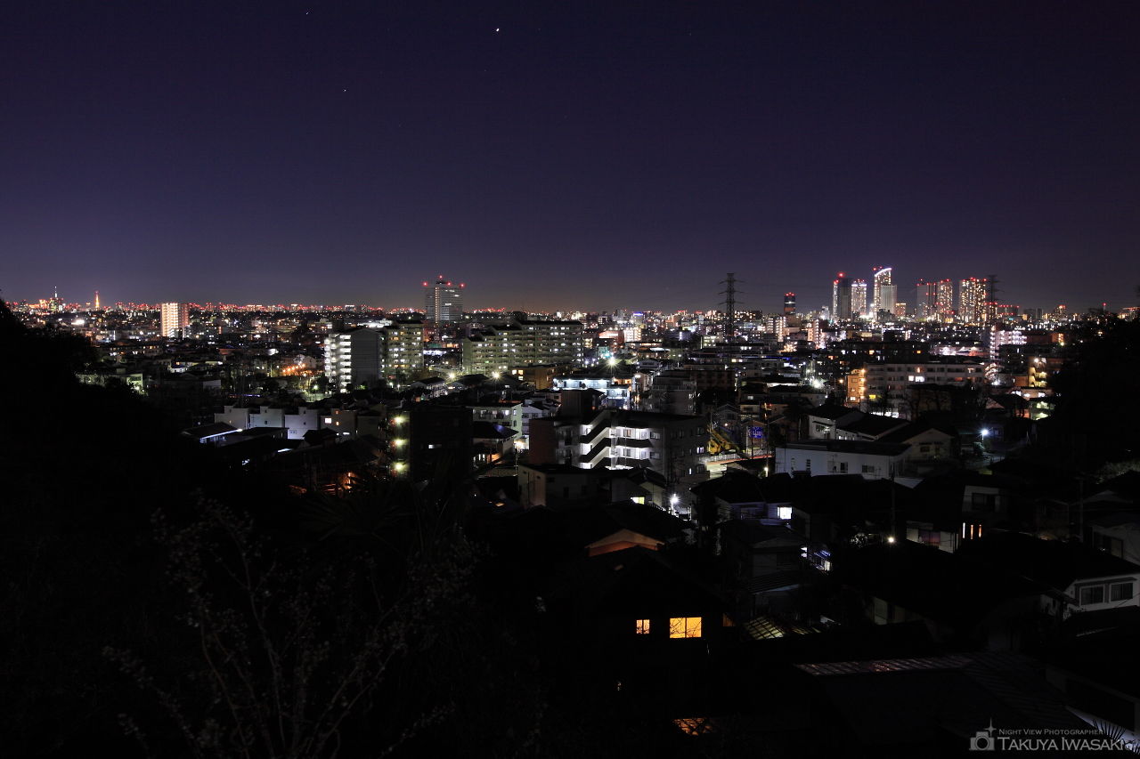 住宅街の中にある小さな神社からは高津区を中心とした夜景を見渡せます。視界は広く、遠くには東京タワー・東京スカイツリーなども望めます。
