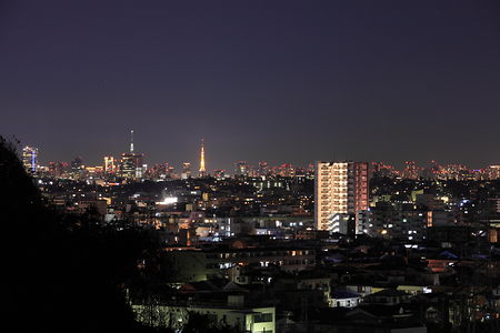 高津区の千年地区は丘陵地となっており、視界の広がるポイントがいくつかあります。たちばな古代の丘緑地から北に歩くと視界が広がった小さな広場があり、付近からは中原区・武蔵小杉方面を中心とした夜景が見渡せます。天気が良ければ東京タワーと東京スカイツリーが並んだ状態で見渡せ、二つのタワーが距離感の関係からほぼ同じ大きさに見えるのも特徴です。住宅街のスポットにしては光量も多く、見応えのある夜景が楽しめますが、深夜の訪問は控えるなどマナーを守って夜景を楽しむようにしましょう。