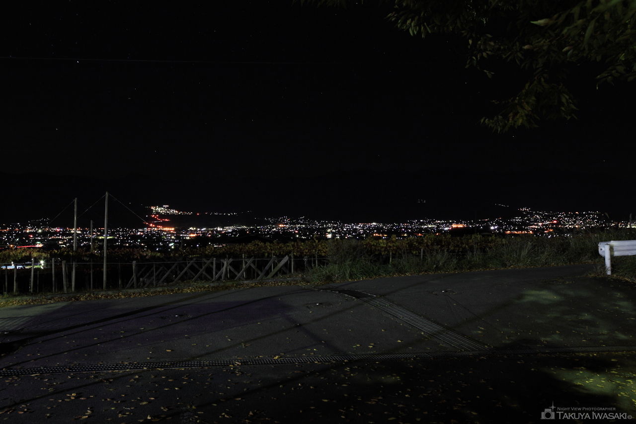 塩山フルーツラインの勝沼側からの入口を超えてすぐの場所に停車スペースがあり、車を停めて山梨市・笛吹市方面の夜景を車内からも観賞できます。