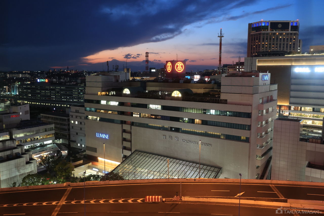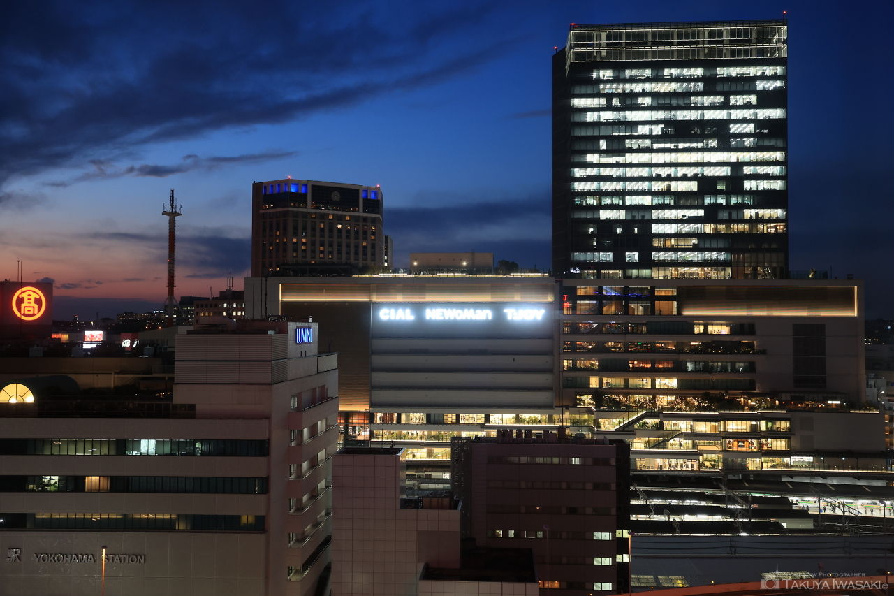 屋上階にある太陽の広場からは、窓ガラス越しに横浜駅周辺の夜景を観賞できます。