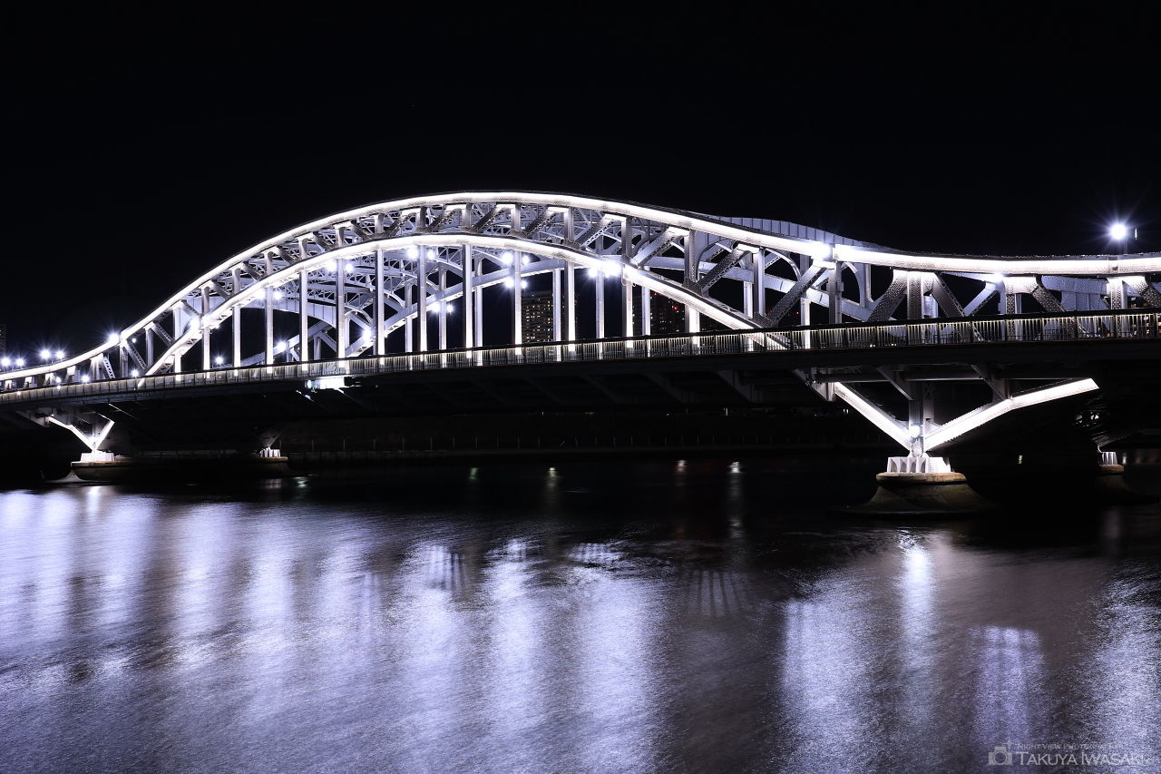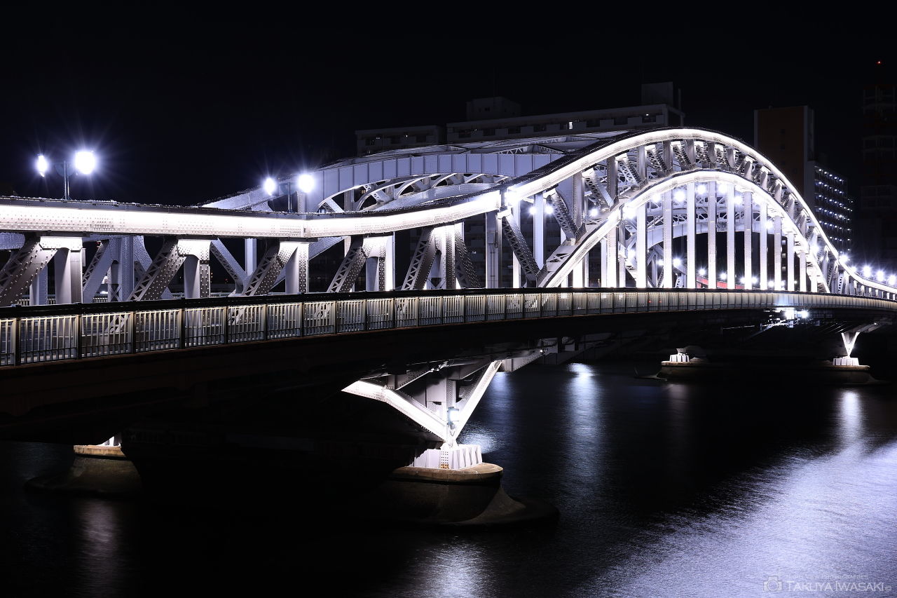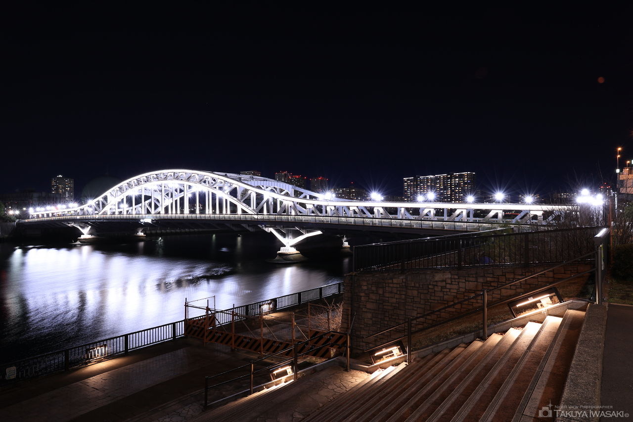 中心の大きなアーチが特徴的で、重圧感と繊細感が共存する橋。白色光のライトアップが美しく、隅田川の東側に整備されたテラスがベストビューポイント。
