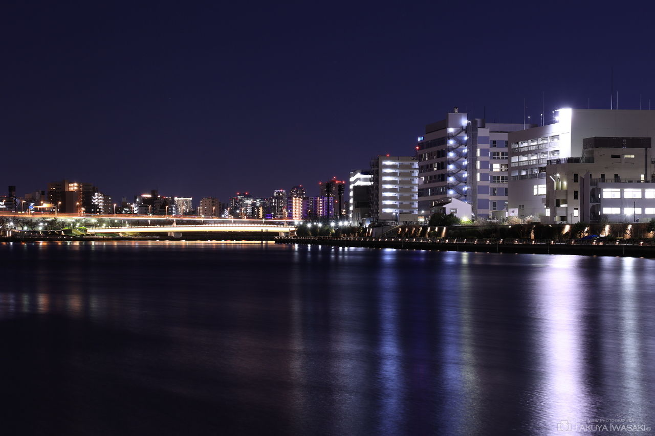 白鬚橋の両側に歩道があり、北側の歩道からは高層マンションや首都高速を中心とした夜景が見渡せます。