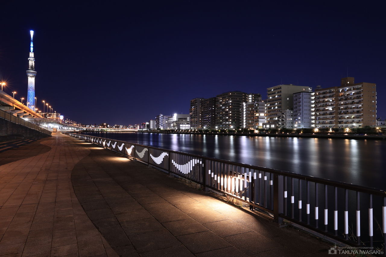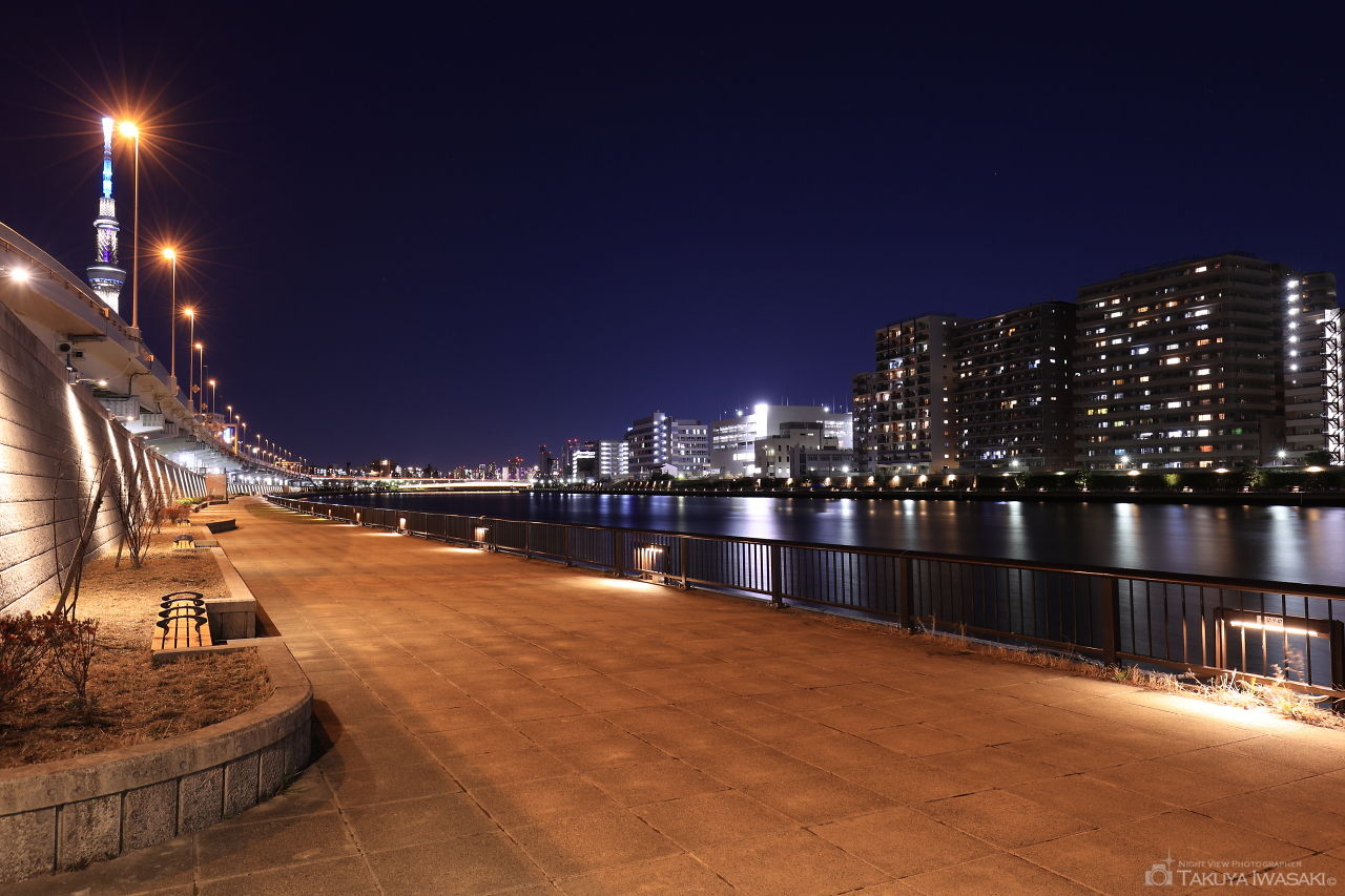 隅田川テラスは東岸のみ整備されており、フットライトで照らされていて雰囲気も良いです。駒形橋や吾妻橋周辺は観光客で混雑しているので、人混みを割けるのであれば、白鬚橋周辺が良いでしょう。