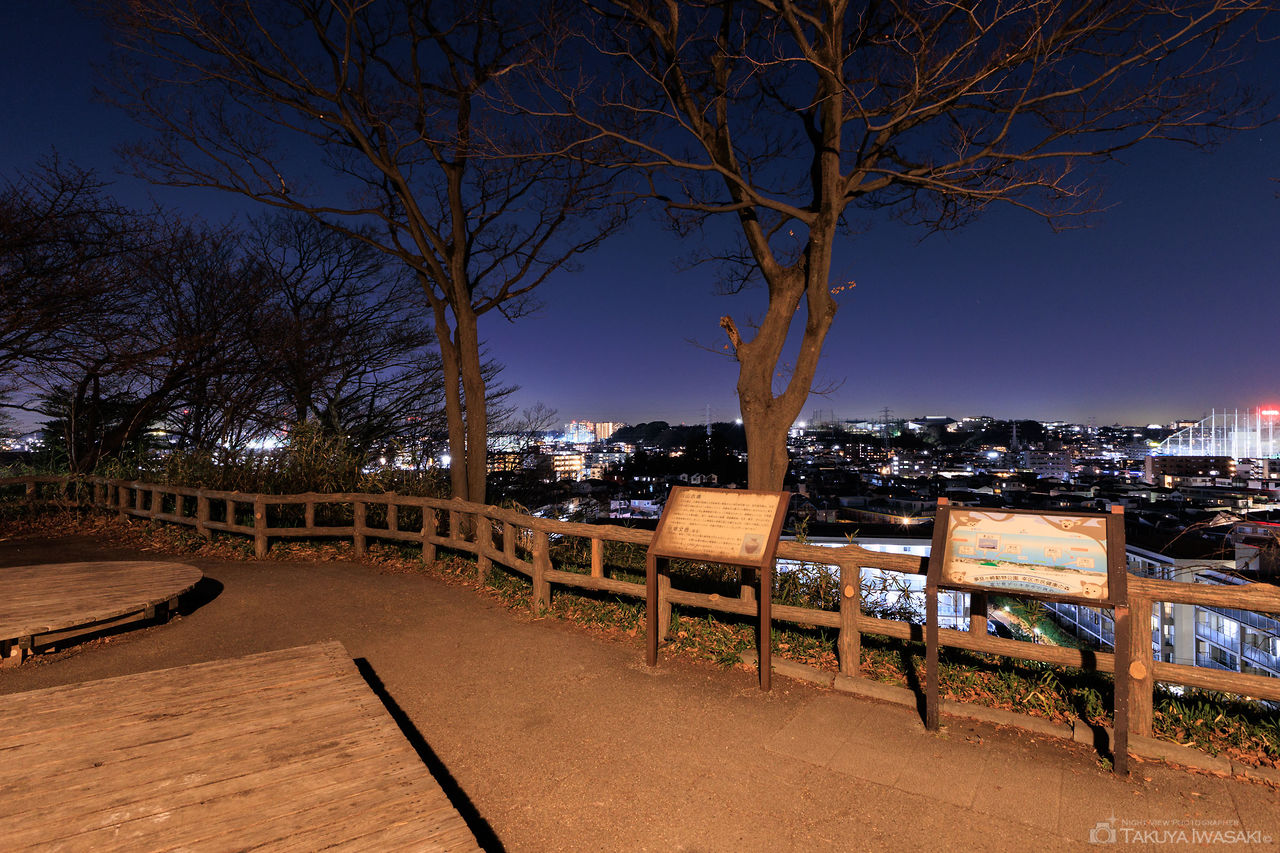 公園内の案内版を見ると「富士見デッキ」と「展望台」の2ヶ所から夜景が見えそうに思えますが、展望台からは残念ながら夜景は観賞できません。一方、富士見デッキの方は視界が開けており、日中であれば富士山が見渡せるのはもちろんのこと、夜には日吉駅方面を中心とした夜景が観賞できます。