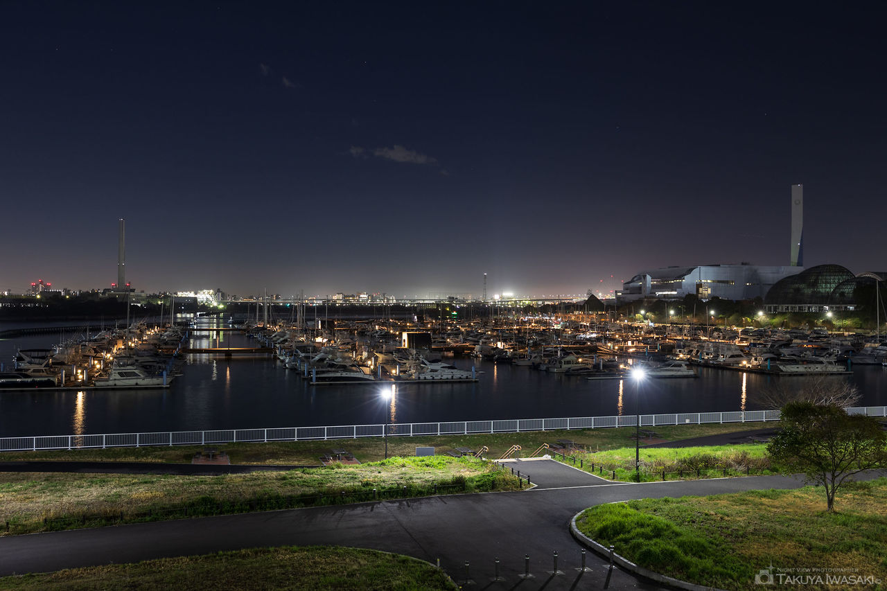 アーチェリーや陸上競技場などの運動施設が充実した夢の島公園ですが、東西にある公園を結ぶ歩道橋である「なぎさ橋」は一段高い場所にあることから、見晴らしが良く、東京スカイツリーや東京夢の島マリーナを見渡せます。早い時間帯であれば、葛西臨海公園の観覧車のライトアップも見渡せ、夜景自体は小規模なものの、ゆったりと夜景を観賞できます。なお、駐車場は公園内に「第一駐車場」と「第二駐車場」がありますが、第二駐車場の方が近くなります。隣接するマリーナも雰囲気が良いので、散歩やデートで訪れるのも良さそうです。
