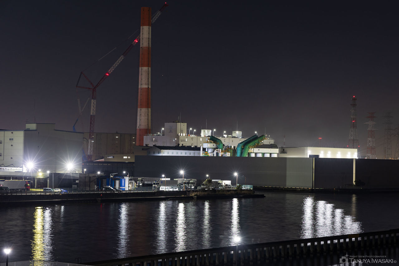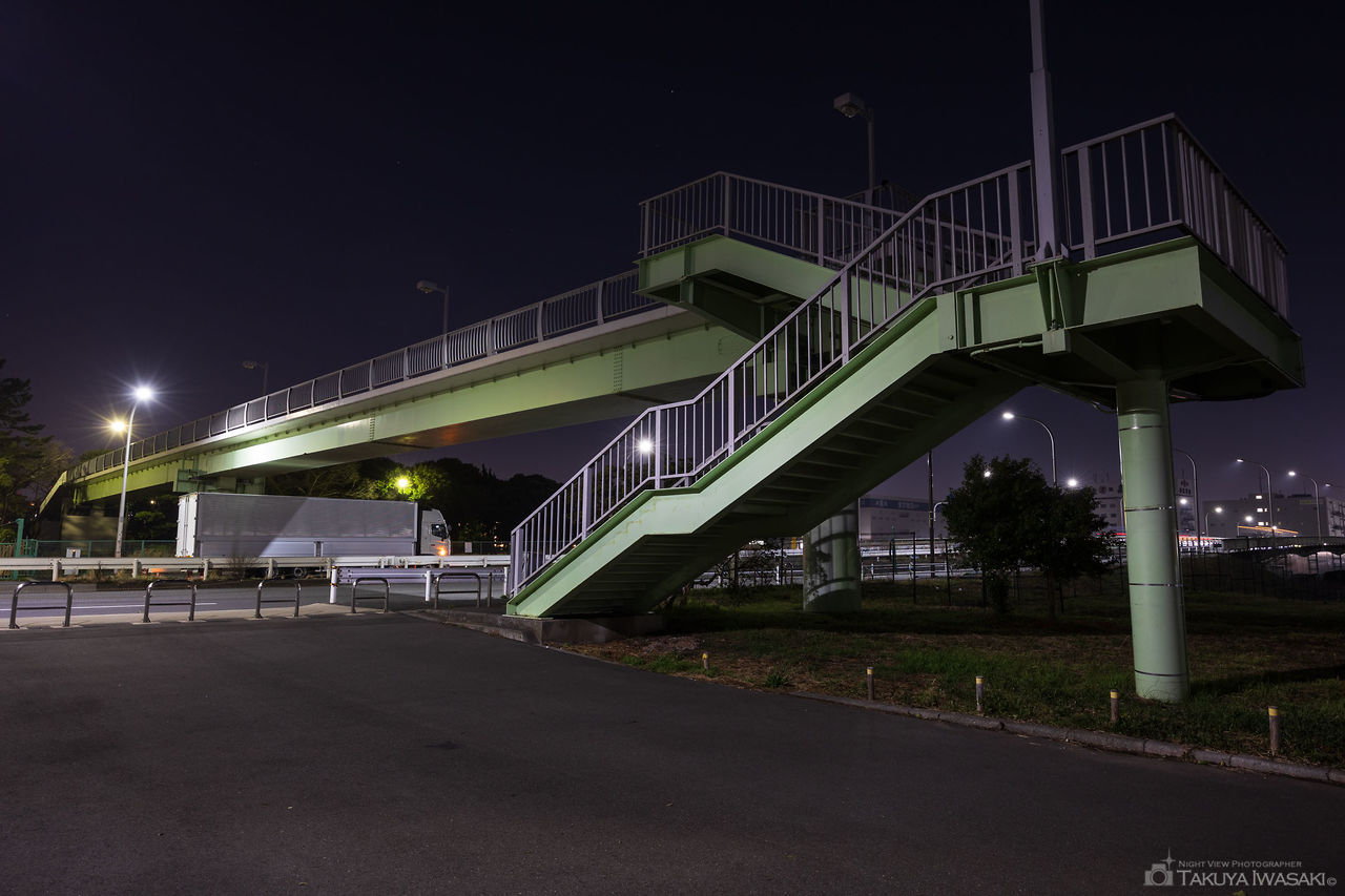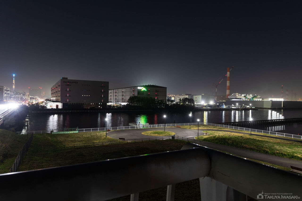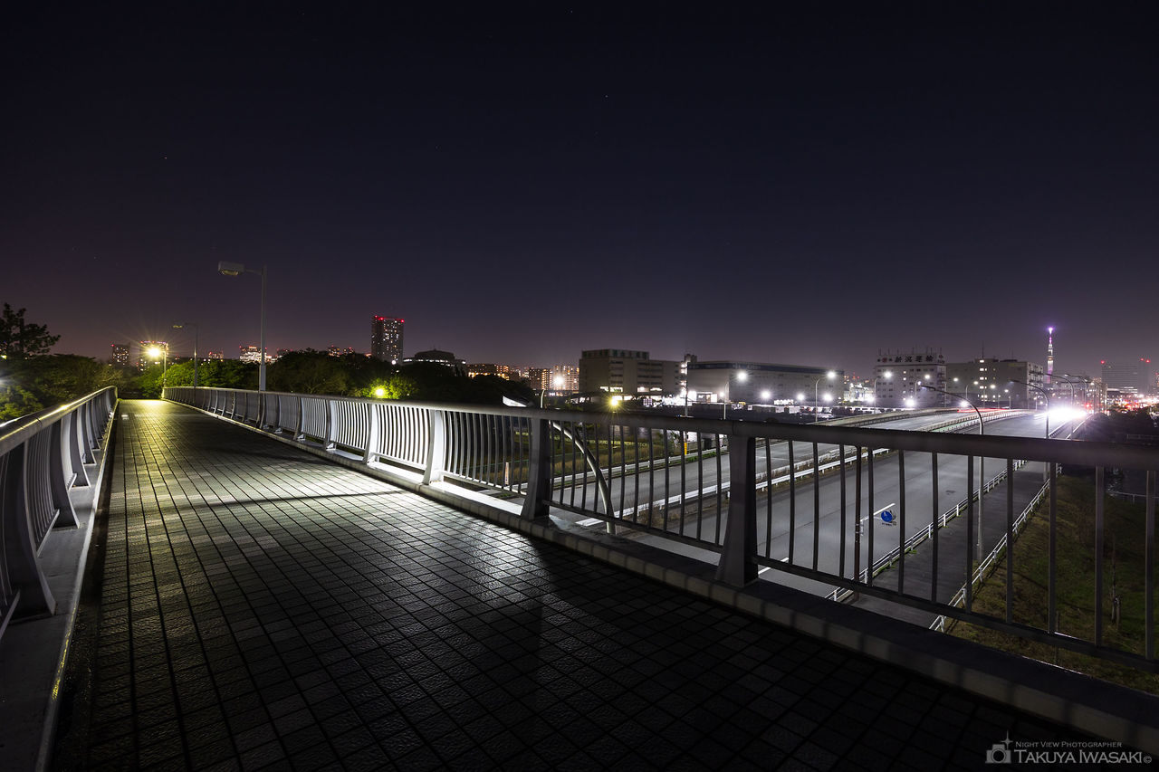 南砂町駅に直結する橋の歩道から、高層マンションや物流拠点を中心とした夜景が見渡せます。