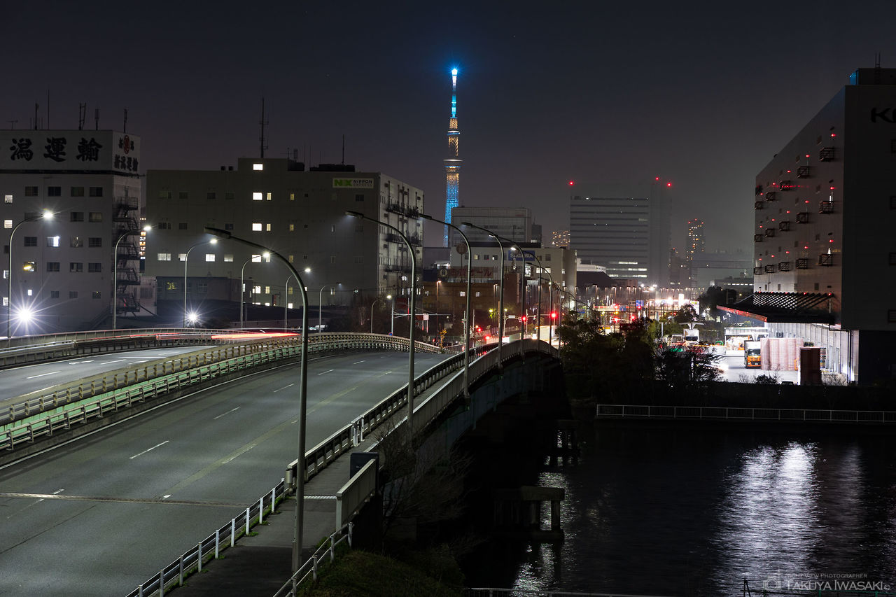 明治通りに架かる歩道橋「なぎさ橋」は、東京スカイツリーを中心に東京夢の島マリーナも見渡せる穴場スポットです。